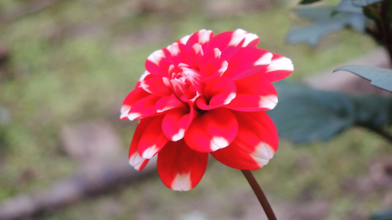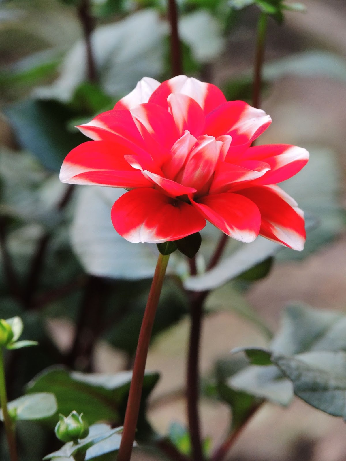 混種的大理花,紅白相間,同一株可開出紅色及白色的花朵