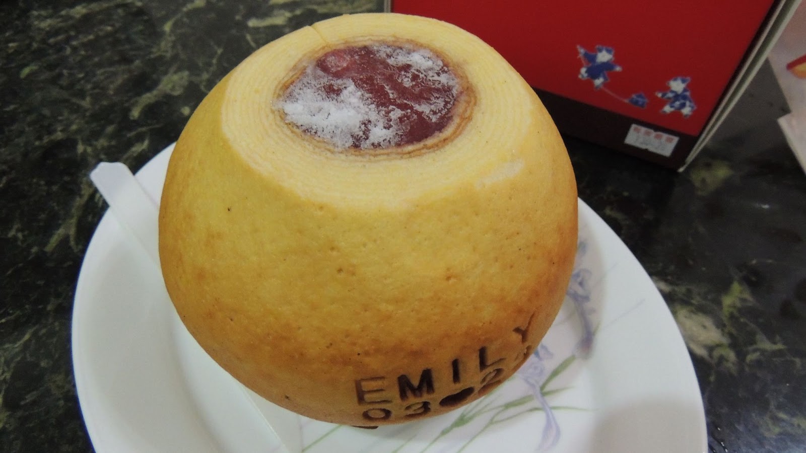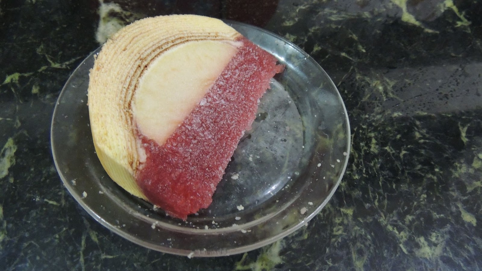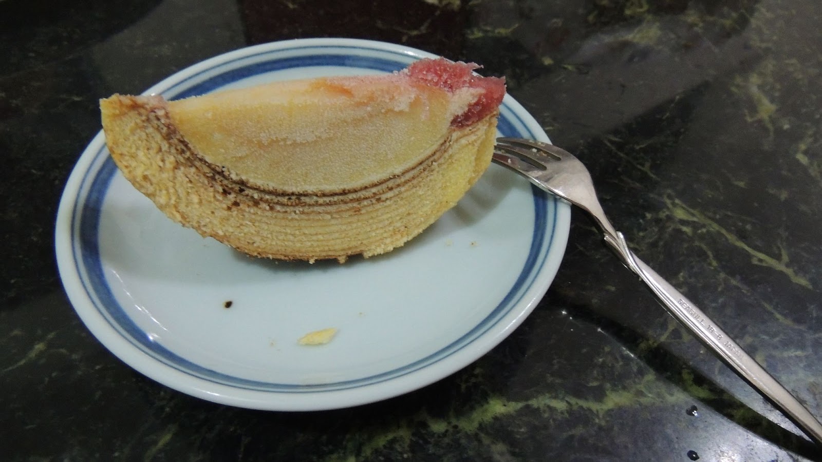 蛋糕分三層,外層是年輪蛋糕,中間是蘋果,最裡面是草莓果凍,層次分明;也許是因為冰凍過,中間那層看起來有點透明,比較像梨子,口感也不像蘋果。整體還不錯吃,也不會太甜。