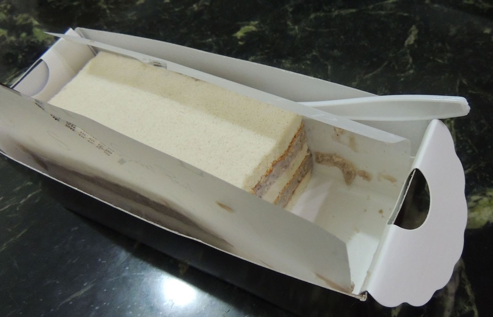 這條蛋糕沒有特殊的造型,標榜的就是100%天然芋泥,不含防腐劑,所以賞味期限只有兩天,離開5°C的冷藏室只能待兩個小時,而且芋泥含量超多;打開蛋糕盒子就聞到濃濃的芋香,從蛋糕的側面可以看得到兩層厚厚的芋泥,果真是重芋泥蛋糕。切了一塊來吃,原來除了入口即化的芋泥以外,還有切成碎丁的芋頭塊和在裡面,口感是多層次的,甜度適中,讓人吃完一塊還想再切第二塊來吃。
